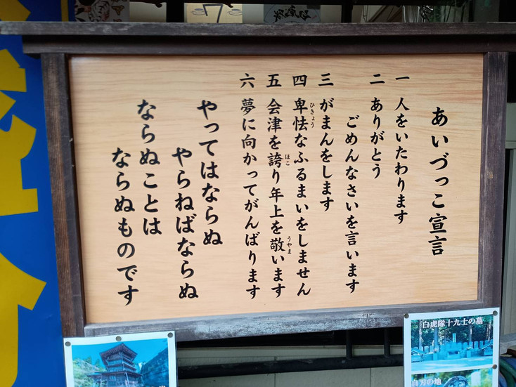 まずスタートの一枚目:めっちゃ雨降ってるの・・・予定より30分くらいゆっくりしてからホテルを出ました。駅前や色んな所に掲げてあるあいづっこ宣言を拝見してから飯盛山に軽く登り、滝沢本陣を探索して参りました。